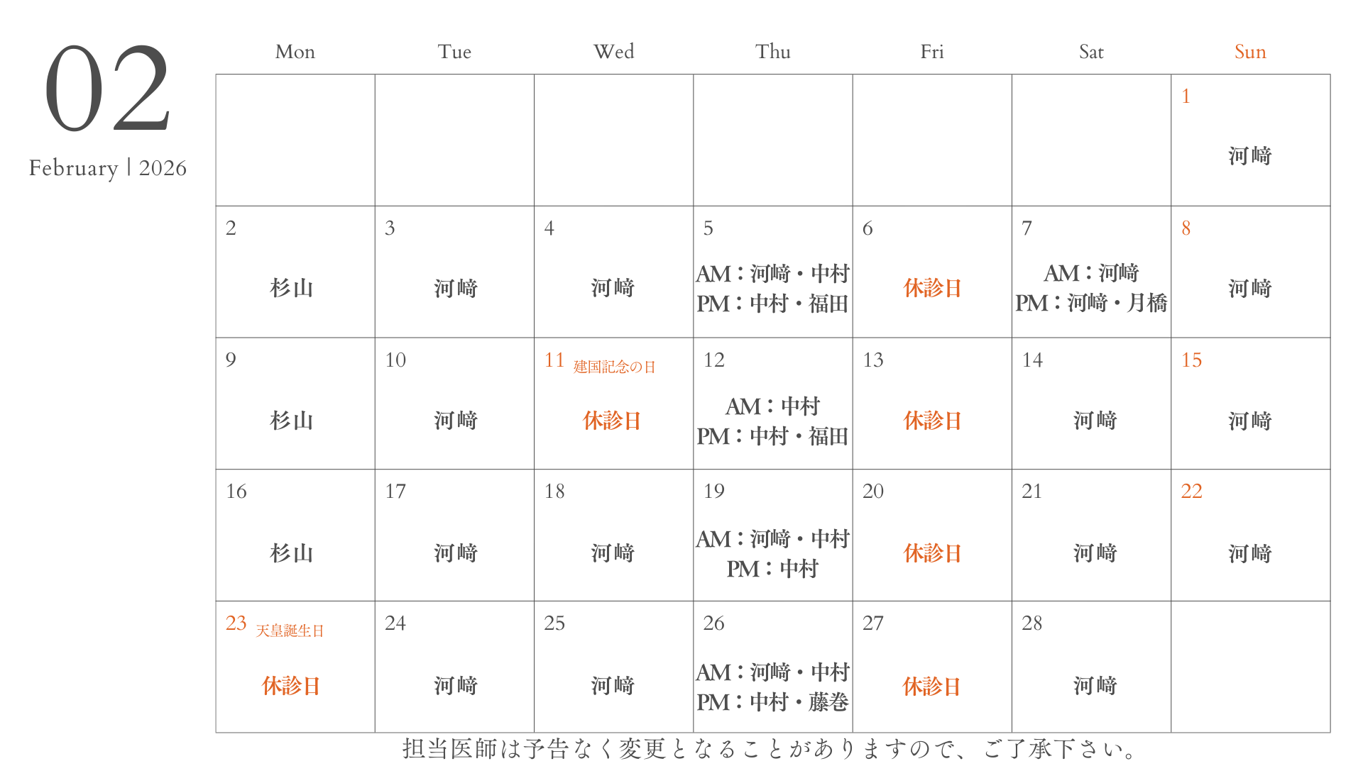 2025年4月より木曜日、土曜日午後は2診体制で行います。