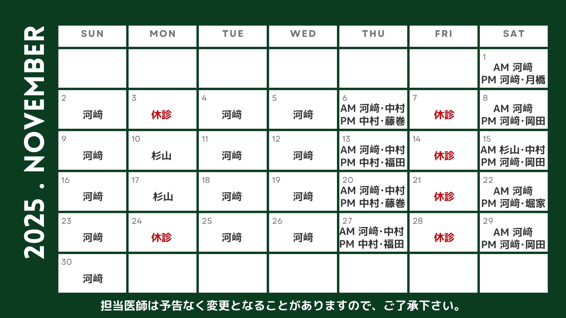 2025年4月より木曜日、土曜日午後は2診体制で行います。