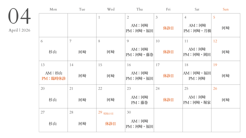 4月診療のお知らせ 投稿日:2026.03.31 4月診療のお知らせ 【4月診療スケジュールのご案内】 いつも当クリニックをご利用いただきありがとうございます😊 4月の診療担当医スケジュールを配信いたします📅 ご来院前にご確認ください🙇 ⚠️4月13日(月)は午後の診療が臨時休診となります。 (※午前は通常通り診療いたします) お間違いのないようご注意ください🙇 まもなく新年度を迎えます🌸新生活や新シーズンに向けて、ケガ予防とコンディション管理に気をつけてお過ごしください☘️